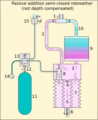 Schematic diagram of the breathing gas circuit of a passive addition semi-closed circuit rebreather.