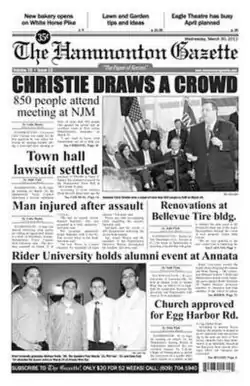 The Hammonton Gazette is a weekly local newspaper located in Hammonton, New Jersey. It was founded in 1997 by the then-23-year-old Gabriel J. Donio. The first print edition was published on July 2, 1997. Gabriel J. Donio is the publisher of The Gazette. Gina L. Rullo is the editor-in-chief. The Gazette staff consists of approximately 30 people. Each Wednesday, the newspaper is distributed throughout Hammonton and the surrounding area. The newspaper primarily covers the town of Hammonton, focusing on local politics, businesses and residents.