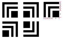 Finder Pattern[3]: 4.2.3 consists from four Position Detection Patterns located at the four corners of the barcode. The size of Position Detection Pattern is 7×7 modules and it is constructed from 5 elements: dark 7 × 7 modules, light 6 × 6 modules, dark 5 × 5 modules, light 4 × 4 modules, dark 3 × 3 modules respectively.