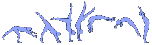 A standing back handspring begins with a three phase sequence. In the first phase, the gymnast stands up straight on flat feet. In the second, the gymnast swings the arms down by the sides of the torso, bends the knees, and sits back as if sitting in a chair; while in this position, the gymnast is unbalanced. In the last phase, the gymnast swings both arms up by the ears, uses the back muscles to propel the upper body, and jumps into the air. The gymnast transitions to an arch position, with the head in a neutral position, arms and legs straight, and feet together; this body shape is maintained until the hands contact the floor. With hands on the floor, the body's angular momentum is used to transform the gymnast's body shape from an arch, through a linear shape, to a "hollow" shape. The hands are then pushed against the floor, causing the body to lift off from the floor while the body continues its feet-first rotation. Finally, the feet land on the floor, behind the body's center of gravity, and the remaining angular momentum is depleted as it carries the gymnast to a stationary standing position.[2] Handsprings are performed on the balance beam with more vertical and less horizontal force compared to those performed on the floor, perhaps to make it easier to place the hands on the narrow beam.[3]