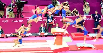 A multiple-exposure image of a gymnast performing the vault at the 2012 Summer Olympics.