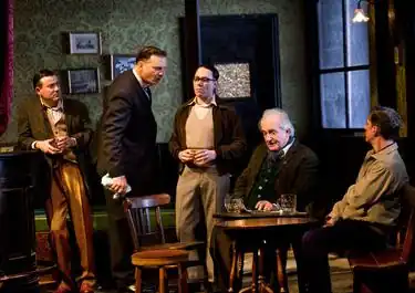The play was scheduled to open on Broadway at the John Golden Theatre on 19 March 2020, but the run was cancelled because of the COVID-19 pandemic after thirteen previews.[24][25] In February 2022, it was announced that the play was once again scheduled to premiere at the John Golden Theatre on 21 April that year, with previews beginning on 8 April. The production saw most of the 2020 cast return, with the exception of Dan Stevens as Mooney, Mark Addy as Harry and Ewen Bremner as Syd, replaced respectively by Alfie Allen, David Threlfall and Andy Nyman.[26] The production closed on 18 June 2022.[27]
