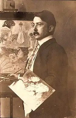 The family moved back to Germany in the 1890s, to Weimar, where Diehl finished his secondary school education and entered the renowned Weimar Akademie für bildende Künste—the Academy of Fine Arts. He received his diploma from the Akademie in 1896, having studied under the Norwegian genre painter Carl Frithjof Smith (1859–1917) and Max Thedy (1858–1924), then as a master’s student with Professor Theodor Hagen, considered one of the founders of German Impressionism. In 1898, he went to study drawing at the Städelsches Kunstinstitut in Frankfurt with Bernhard Mannfeld (1848–1925), who remained a lifelong friend and confidant. During these years of study, he traveled to Paris, Switzerland, the Baltic coast, and Hungary. During his years in Frankfurt, he established a lifelong friendship with the German naturalist painter Wilhelm Trübner; the older artist helped Diehl to establish himself as an academic painter. Through Trübner, he gained access to the Kunstsalon Bangel, where he participated in his first group exhibition in 1900. Of his works in this show, one critic praised his "quiet landscapes" as imparting a sense of rumination on life and stillness.[2] [b] At this time he began referring to himself as Hanns Diehl-Wallendorf, apparently as a way to distinguish himself from another artist named Hans Diehl.