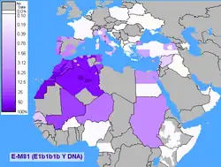 The E-M183 sub haplogroup reaches a mean frequency of 42% in North Africa. It decreases in frequency from 100% among some populations to approximately 28.6% to the east of this range in Egypt.[3][22][23] The E-M81 subclade is predominant among North-African Berber speaking populations and Maghrebi Arabs. In Tunisia, it reached 100% frequency among a sample of Arabs from Zriba,[24] 89.5% in Andalusians (Qalaat-al-Andalous) and 100% in Berbers from Chenini-Douiret, Jradou and Takrouna.[24] It is generally found at frequencies around 45% in coastal cities of the Maghreb (Oran, Tunis, Algiers).[3][25] It is also prevalent among other Berber populations and reaches frequency of 72.4% in Marrakesh Berbers,[26] 80% in Mozabite, and 71% in Middle Atlas Berbers (Moyen). It also reaches high levels (77.8%) among the Tuareg population inhabiting the Sahara in Burkina Faso, near Gor it reaches a much lower frequency of 11.1% in the vicinity of Tanut in the Republic of Niger.