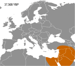 Haplogroup IJ was in the Middle East and/or Europe about 40,000 years ago. The TMRCA (time to most recent common ancestor) for I-M170 was estimated by Karafet and colleagues in 2008 to be 22,200 years ago, with a confidence interval between 15,300 and 30,000 years ago.[4] This would make the founding event of I-M170 approximately contemporaneous with the Last Glacial Maximum (LGM), which lasted from 26,500 years ago until approximately 19,500 years ago.[14] TMRCA is an estimate of the time of subclade divergence. Rootsi and colleagues in 2004 also note two other dates for a clade, age of STR variation, and time since population divergence. These last two dates are roughly associated, and occur somewhat after subclade divergence. For Haplogroup I-M170 they estimate time to STR variation as 24,000 ±7,100 years ago and time to population divergence as 23,000 ±7,700 years ago.[1] These estimates are consistent with those of Karafet 2008 cited above. However, Underhill and his colleagues calculate the time to subclade divergence of I1 and I2 to be 28,400 ±5,100 years ago, although they calculate the STR variation age of I1 at only 8,100 ±1,500 years ago.[15]