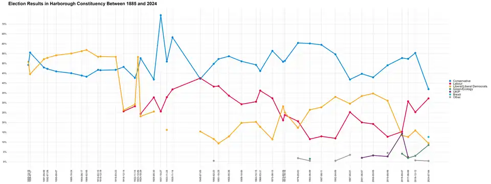 Harborough vote share as a percentage since the seat's formation in 1885.