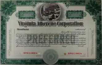 The postcard photograph of Locomotive No. 3 pulling a trainload of granite blocks saw continued life in other forms. The picture became something of a "stock photo" in the 1920s and was reproduced—typically without attribution—far from Vermont. This included such circumstances as stock certificates of, for example, the Virginia Alberene Corporation (see photo), which used a short-line industrial railroad to move blocks of soapstone.[18]