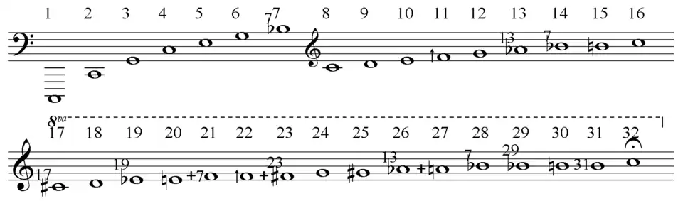 - ^ Fonville, John (Summer 1991). "Ben Johnston's Extended Just Intonation: A guide for interpreters". Perspectives of New Music. 29 (2): 106–137 (121). doi:10.2307/833435. JSTOR 833435.