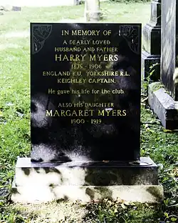 Harry Myers (February 1875 – 19 December 1906) from Horsforth, Leeds was a Rugby Union and later Northern Union (rugby league) footballer who played in the 1890s and 1900s. He played rugby union for Horsforth, Bramley and Keighley and played one international match for England as well representative rugby for Yorkshire. In 1900 he changed codes to play rugby league (then known as Northern Union football). He died in 1906 after an accident during a game for Keighley against Dewsbury.