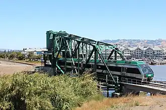 The Haystack Landing Bridge is a railroad bridge owned by Sonoma-Marin Area Rail Transit (SMART) at Haystack Landing in Petaluma, California. The original Haystack Landing bridge, which was built in 1903 and installed in 1904, was a Warren truss swing bridge built by the Pennsylvania Steel Company.[1][2] It was operated by buttons on the approach trestles, and had a 5-horsepower (3.7 kW) electric motor, as well as fabric belts and bevel gears. The turntable upon which it rotated had a diameter of 10 feet (3.0 m).[2] When planning out their commuter rail system, SMART estimated that it would cost approximately 20 million dollars for the bridge to be used for passenger service, so they opted for the cheaper option of buying a used drawbridge. They decided upon the old Galveston Causeway railroad bridge, that was planned to be scrapped.[3]