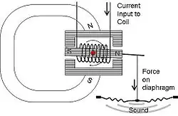 The moving coil driver, more commonly referred to as a "dynamic" driver is the most common type used in headphones. It consists of a stationary magnet element affixed to the frame of the headphone, which sets up a static magnetic field. The magnet in headphones is typically composed of ferrite or neodymium. A voice coil, a light coil of wire, is suspended in the magnetic field of the magnet, attached to a diaphragm, typically fabricated from lightweight, high-stiffness-to-mass-ratio cellulose, polymer, carbon material, paper or the like. When the varying current of an audio signal is passed through the coil, it creates a varying magnetic field that reacts against the static magnetic field, exerting a varying force on the coil causing it and the attached diaphragm to vibrate. The vibrating diaphragm pushes on the air to produce sound waves.