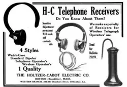 One of the earliest companies to make headphones for wireless operators was the Holtzer-Cabot Company in 1909.[20] They were also makers of head receivers for telephone operators and normal telephone receivers for the home.[20] Another early manufacturer of headphones was Nathaniel Baldwin.[21] He was the first major supplier of headsets to the U.S. Navy.[22] In 1910, motivated by his inability to hear sermons during Sunday service, he invented a prototype telephone headset.[23] He offered it for testing to the navy, which promptly ordered 100 of them. Wireless Specialty Apparatus Co., in partnership with Baldwin Radio Company, set up a manufacturing facility in Utah to fulfill orders.[24] These early headphones used moving iron drivers,[25] with either single-ended or balanced armatures. The common single-ended type used voice coils wound around the poles of a permanent magnet, which were positioned close to a flexible steel diaphragm. The audio current through the coils varied the magnetic field of the magnet, exerting a varying force on the diaphragm, causing it to vibrate, creating sound waves. The requirement for high sensitivity meant that no damping was used, so the frequency response of the diaphragm had large peaks due to resonance, resulting in poor sound quality. These early models lacked padding, and were often uncomfortable to wear for long periods. Their impedance varied; headphones used in telegraph and telephone work had an impedance of 75 ohms. Those used with early wireless radio had more turns of finer wire to increase sensitivity. Impedances of 1,000 to 2,000 ohms was common, which suited both crystal sets and triode receivers. Some very sensitive headphones, such as those manufactured by Brandes around 1919, were commonly used for early radio work.