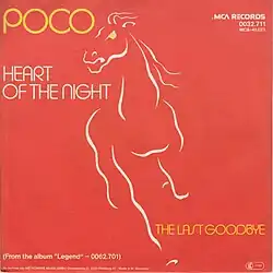 The album Legend was released in November 1978 with the lead single "Crazy Love" released in January 1979 to become Poco's first Top 40 hit. "Heart of the Night" was issued as the second single from Legend in May 1979, reaching a Hot 100 peak of #20.[11] Billboard ranked "Heart of the Night" as a #5 Easy Listening hit.[12] The track also appeared on the C&W chart at #96. In Canada "Heart of the Night" peaked at #18.[13]