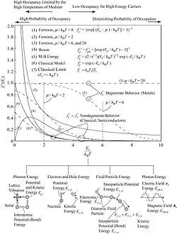Variation of equilibrium particle distribution function with respect to energy for different energy carriers.