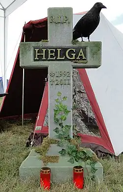 A person may call for a Helga;[1] others answer and create a chorus-like group effect.[2] "Helga ist tot!" (Helga is dead) denies the request.[3] Further allegations are gravestones, memorials or graffiti. The background is unknown; some point to a rather rainy Hurricane Festival in Scheeßel, where a high pressure cyclone called Helga was called for but did not arrive in time. The call is also the origin of the name for an annual prize for German festivals,[4] and is being used by a service company.[5]