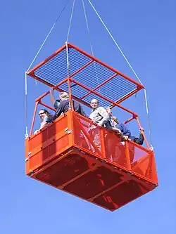 This type of basket was tested by the Air National Guard in 2006, and were found to be quite functional. Guard personnel tested out a basket which could fit up to 15 people, at the Air National Guard-Air Force Reserve Command Test Center at Tucson, Ariz. The basket which was tested is known as the Heli-Basket, is 4-and-a-half foot by 8-and-a-half feet, and hangs on a 125-foot cable below an HH-60G Pave Hawk helicopter. it was invented by John Tollenaere, of the company Precision Lift, Inc.[2]
