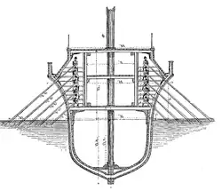 Based on iconographic evidence from coins, Morrison and Coates have determined that the Punic triremes in the 5th and early 4th centuries BC were largely similar to their Greek counterparts, most likely including an outrigger.[22] From the mid-4th century, however, at about the time the quinquereme was introduced in Phoenicia, there is evidence of ships without outriggers. This would have necessitated a different oar arrangement, with the middle level placed more inwards, as well as a different construction of the hull, with side-decks attached to it. From the middle of the 3rd century BC onwards, Carthaginian "fives" display a separate "oar box" that contained the rowers and that was attached to the main hull. This development of the earlier model entailed further modifications, meaning that the rowers would be located above deck, and essentially on the same level.[23][24] This would allow the hull to be strengthened, and have increased carrying capacity in consumable supplies, as well as improve the ventilation conditions of the rowers, an especially important factor in maintaining their stamina, and thereby improving the ship's maintainable speed.[25] It is unclear however whether this design was applied to heavier warships, and although the Romans copied the Punic model for their quinqueremes, there is ample iconographic evidence of outrigger-equipped warships used until the late imperial period.