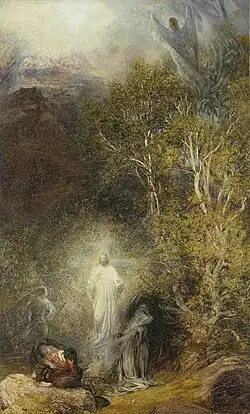 Whaite displayed a vibrant style in his watercolours, and was noted for his ability to capture changing weather conditions in his landscapes, which often evoked a religious wonder.[6] His religious beliefs were a strong influence on his work, and although his faith emerged in his work through an attached moral significance to the landscape, he also painted explicitly Christian themes as in The Awakening of Christian (c. 1885) and Arthur in the Gruesome Glen.[6]