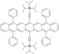 7,16-Bis(tris(trimethylsilyl)silylethynyl)heptacene was synthesized in 2005.[11] This compound is stable in the solid state for a week but decomposes in contact with air. Its synthesis started from anthraquinone and naphthalene-2,3-dicarboxaldehyde. More stable substituted heptacenes have been reported: with stabilizing p-(t-butyl)thiophenyl substituents (Figure 1)[12] and with phenyl and triisopropylsilylethynyl groups (Figure 2).[13]