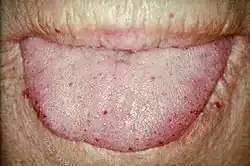Telangiectasia (small vascular malformations) may occur in the skin and mucosal linings of the nose and gastrointestinal tract. The most common problem is nosebleeds (epistaxis), which happen frequently from childhood and affect about 90–95% of people with HHT. Lesions on the skin and in the mouth bleed less often but may be considered cosmetically displeasing; they affect about 80%.[1][2] The skin lesions characteristically occur on the lips, the nose and the fingers, and on the skin of the face in sun-exposed areas. They appear suddenly, with the number increasing over time.[2]