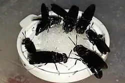 An adult female lays approximately 200 to 600 eggs at a time.[16] These eggs are typically deposited in crevices or on surfaces above or adjacent to decaying matter such as manure or compost, and hatch in about 4 days.[17] Freshly emerged larvae are 1.0 millimetre (0.04 in) long, being able to reach a length of 25 millimetres (1 in) and weight of 0.10 to 0.22 grams (1.5 to 3.4 gr) by the end of larval stage.[15] The larvae are able to feed on a wide variety of organic matter,[18][19][20][21] adapting to diets with different nutrient content.[22] The larval stage lasts from 18 to 36 days, depending on the food substrate provided to the larvae,[16][23] of which the post-feeding (prepupal) stage lasts around 7 days.[24] The length of larval stage can be delayed by months due to low temperature or lack of food.[17] The pupal stage lasts from 1 to 2 weeks.[24][25] Adults can live typically 47 to 73 days when provided with water and food, such as sugar in captivity or nectar in the wild,[26][27] or survive for about 8 to 10 days on fat reserves gathered during larval stage when water is provided.[16]