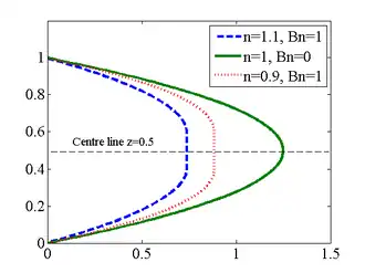 Velocity profile of the Herschel–Bulkley fluid for various flow indices n. In each case, the non-dimensional pressure is . The continuous curve is for an ordinary Newtonian fluid (Poiseuille flow), the broken-line curve is for a shear-thickening fluid, while the dotted-line curve is for a shear-thinning fluid.