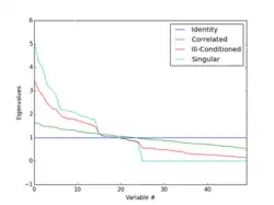 The condition number of a covariance, correlation, or any symmetric (and thus diagonalizable) matrix is defined as the absolute value of the ratio between its largest and smallest eigenvalues in modulus. The figure on the right presents the sorted eigenvalues of several correlation matrices; the condition number is represented by the ratio of the first to last eigenvalues in each sequence. A diagonal correlation matrix, which is equal to its own inverse, exhibits the minimum possible condition number.