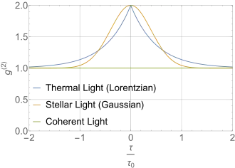 This model fits the observation that was done by Hanbury Brown and Twiss using stellar light as demonstrated in figure 3. If thermal light was used instead of stellar light in the same setup, then we would see a different function for the second order coherence.[10] Thermal light can be modeled to be a Lorentzian power spectrum centered around frequency , which means , where is the coherence length of the beam. Correspondingly, and . The second-order coherence for stellar (Gaussian), thermal (Lorentzian) and coherent light is shown in Figure 4.