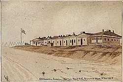 During the Civil War, Fort Walker was a Confederate fort in what is now Port Royal Plantation. The fort was a station for Confederate troops, and its guns helped protect the 2-mile wide (3 km) entrance to Port Royal Sound, which is fed by two slow-moving and navigable rivers, the Broad River and the Beaufort River. It was vital to the Sea Island Cotton trade and the southern economy.[28] On October 29, 1861, the largest fleet ever assembled in North America moved south to seize it.[29] In the Battle of Port Royal, the fort came under attack by the U.S. Navy, and on November 7, 1861, it fell to over 12,000 Union troops.[30] The fort was renamed Fort Welles, in honor of Gideon Welles, the Secretary of the Navy.[31]
