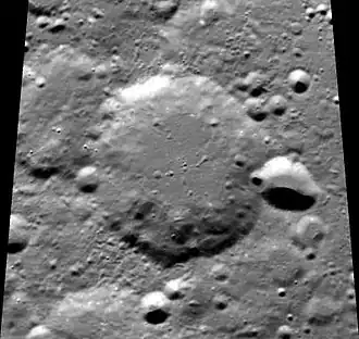 This is a relatively old formation that has become worn and eroded due to subsequent impacts. The general outline of the outer rim is still visible, but it is overlaid along the eastern edge by a smaller crater. There is also a small craterlet along the western edge. The inner wall is marked by a number of tiny craterlets, and is slightly wider at the southern edge with a ridge-like projection. The interior floor is level and almost featureless, with only a few tiny craterlets to mark the surface.