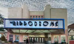 In 1945, The Hippodrome Theater caught fire.[7] The origin of the fire was never fully determined, although it was believed to be caused by a short circuit in the theater's wiring.[7] In 1947, The Hippodrome reopened its doors to the public.[8] After the fire the theater was renovated and remodeled in an Art Deco style of architecture.[9] The updated theater included new features such as air conditioning and the latest technical equipment.[10] The elaborate ceremony for the reopening of the historical theater attracted an impressive crowd of 2,500 individuals.[11] Once the theater was reopened after the fire, it functioned primarily as a movie theater throughout the 1950s.[2][12] The Hippodrome Theater closed again in the 1960s, re-opened again, then closed once again in the 1970s and functioned as a church for a short period of time.[2] The Hippodrome Theater reopened in the 1980s as a movie theater .