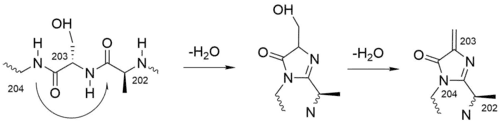 Proposed autocatalytic formation of MIO cofactor in another enzyme, phenylalanine ammonia-lyase, from the tripeptide Ala-Ser-Gly by two water elimination steps.