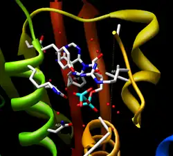 Histidine kinases (HK) are multifunctional, and in non-animal kingdoms, typically transmembrane, proteins of the transferase class of enzymes that play a role in signal transduction across the cellular membrane.[1] The vast majority of HKs are homodimers that exhibit autokinase, phosphotransfer, and phosphatase activity. HKs can act as cellular receptors for signaling molecules in a way analogous to tyrosine kinase receptors (RTK). Multifunctional receptor molecules such as HKs and RTKs typically have portions on the outside of the cell (extracellular domain) that bind to hormone- or growth factor-like molecules, portions that span the cell membrane (transmembrane domain), and portions within the cell (intracellular domain) that contain the enzymatic activity. In addition to kinase activity, the intracellular domains typically have regions that bind to a secondary effector molecule or complex of molecules that further propagate signal transduction within the cell. Distinct from other classes of protein kinases, HKs are usually parts of a two-component signal transduction mechanisms in which HK transfers a phosphate group from ATP to a histidine residue within the kinase, and then to an aspartate residue on the receiver domain of a response regulator protein (or sometimes on the kinase itself). More recently, the widespread existence of protein histidine phosphorylation distinct from that of two-component histidine kinases has been recognised in human cells.[2][3] In marked contrast to Ser, Thr and Tyr phosphorylation, the analysis of phosphorylated Histidine using standard biochemical and mass spectrometric approaches is much more challenging,[4][5] and special procedures and separation techniques are required for their preservation alongside classical Ser, Thr and Tyr phosphorylation on proteins isolated from human cells.[6]