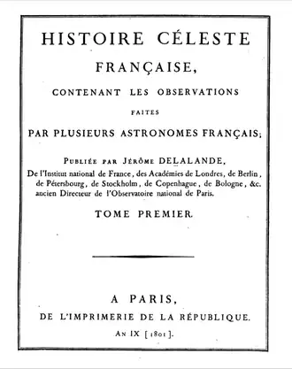 • Joseph Jérôme Le Français de Lalande (1801). Histoire céleste française (in French). Vol. tome premier. Paris: Imprimerie de la République.