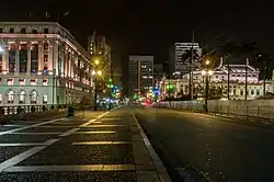 Viaduto do Chá at night, with the Municipal Theater (right).
