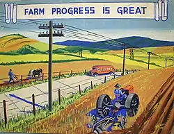 All the elements of this painting were included to reflect Cooperative Extension's vision for 20th century farming – mechanized farming, crop diversification and rural electrification.