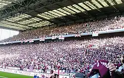 Docherty rebuilt confidence in the team, and Villa went on to win five consecutive games and retained a place in the Second Division. In the short time that Docherty had been at the club, attendances rose significantly from a low of just over 12,000 against Charlton Athletic in December. In the summer of 1969 the first share issue since 1896 raised £200,000 for the club, £140,000 of which was spent on new players.[6] In the following season, however, Villa took ten games to register a win. By Christmas 1969, they were at the bottom of the Second Division, and Docherty was sacked. His successor, Vic Crowe, was unable to prevent the team from being relegated to the third tier of English football for the first time in its history in the 1969–70 season. Despite finishing fourth in the Third Division in the 1970–71 season, Villa reached the League Cup final after beating Manchester United in the semi-final. They were defeated in the final by Tottenham Hotspur 2–0.[7] The 1971–72 season saw the club return to the Second Division as champions with a then divisional record 70 points.[8] They were invited to take part in the 1972 FA Charity Shield but lost 1–0 to Manchester City. In the autumn of 1972, there was a revolt in the boardroom, and four of the five directors voted to oust Doug Ellis from the board. Within 43 days though, Ellis was reinstated as chair after he had received the support of the largest shareholder Pat Matthews, and supporters at an extraordinary general meeting who voted to replace the existing directors.[9] Their first season back in the Second Division in 1972–73 saw Villa narrowly miss out on a second successive promotion when they finished third. However, the following season Villa finished 14th and Ellis sacked Crowe, replacing him with Ron Saunders.[10]