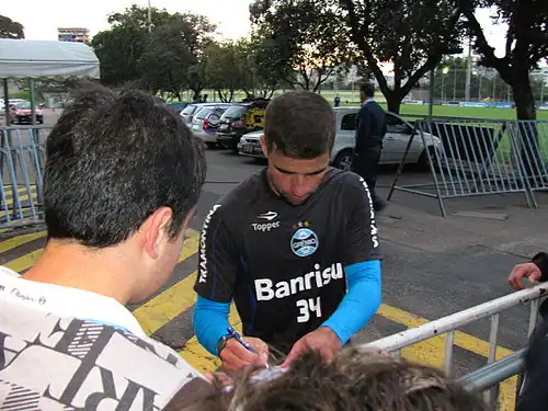 On August 9, 2015, the team, already enjoying a strong moment, made history by thrashing Internacional 5–0 in the 17th round of the Campeonato Brasileiro. This scoreline replicated a margin of victory not seen in over 50 years.[84] Grêmio's display of football superiority - unusual in a derby known for its equilibrium - plunged Internacional into a technical and political crisis, with some fans calling for the president's resignation. Grêmio, meanwhile, gained momentum in the competition, confirming their fine form by defeating the league leaders, Atlético-MG, in the next round at Mineirão. That match featured a goal where Grêmio transitioned from their defensive third, exchanging 23 passes before scoring—a play celebrated worldwide as a "masterclass in counter-attacking."[85] Grêmio finished the Campeonato Brasileiro in third place, behind only Corinthians and Atlético Mineiro, securing a spot in the 2016 Copa Libertadores.[86] Notably, Grêmio was the only team not to lose to Corinthians throughout the tournament, defeating them 3–1 at home and drawing 1–1 away.[87][88] Standout performers included goalkeeper Marcelo Grohe, the attacking duo of Luan and Pedro Rocha, the creative midfielder Douglas, Fernandinho, midfielder Maicon, and defender Pedro Geromel.