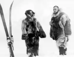European whalers sometimes adopted Inuit garments for Arctic travel, occasionally even going so far as to hire entire families of Inuit to travel with them and sew skin clothing.[58][63] Use of Inuit clothing reportedly reduced deaths from exposure on whaling ships.[59][64] By the mid-1800s, it was common for American and British polar explorers to trade for or commission Inuit garments.[59] Canadian explorers Diamond Jenness and Vilhjalmur Stefansson lived with the Inuit during the Canadian Arctic Expedition (1913–1916), adopting Inuit clothing and making in-depth studies of its construction.[64][65] The Scandinavian personnel of the Fifth Thule Expedition (1922–1924) did the same.[65]