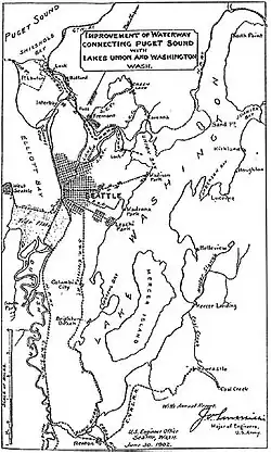 June 1902 map proposing the Lake Washington Ship Canal shows streets and railways from that time.
