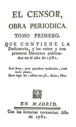 The most influential of all newspapers (it was copied by figures such as Manuel Rubín de Celis, Pedro Centeno, and José Marchena Ruiz de Cueto) was El Censor by lawyers Luis María García del Cañuelo (of a malcontent and aggressive nature) and Luis Marcelino Pereira (an expert on economic issues) (1781).[23] It had encyclopedist, liberal, regalist, and Jansenist influences, and dared to question legislative and religious policies and principles. It engaged in profound social criticism of institutions and questioned the statist structure of society. Therefore, it had to fight constantly to obtain a printing license and then against censorship and opposition by the conservative power, represented by official apologist Juan Bautista Pablo Forner. The latter was parodied in Oración apologética por la África y su mérito literario. It also published a fake Carta marrueca by Cadalso and the utopia of the Ayparchontes. Despite all of this, it went on to have eight volumes and 167 speeches, although it was put on hold three times and was continued by a series of imitators such as El Corresponsal del Censor, El Observador by José Marchena Ruiz de Cueto, influenced by Jeremy Bentham's utilitarianism, defender of physiocracy and of natural law or jusnaturalism, as well as equally opposed to Fornerian apologists. In fact, according to José Miguel Caso González, El Censor covered up a well-formed enlightened pressure group, those who were habitués of the Countess of Montijo's salon: Gaspar Melchor de Jovellanos, Juan Meléndez Valdés, Antonio Tavira y Almazán, José de Vargas Ponce, and Félix María de Samaniego. They are the ones responsible for some of the speeches, especially Meléndez and Jovellanos, the latter under the pseudonym Conde de las Claras.[note 20]