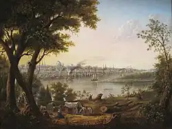 One final component of city infrastructure that was created before the Civil War was the city's water system. Originally, city residents used river water, hauled directly from the riverbank slightly north of the city.[54][55] Starting in 1830, a pumping station and reservoir was built on top of a Native American mound, but it quickly became inadequate to the city's needs.[54] In 1843 and 1845 the station and reservoir were expanded, but again proved inadequate.[56] Four new reservoirs were built between 1849 and 1860, but prior to the Civil War, there was no significant improvement in water quality or supply.[56]