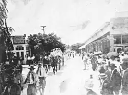 On November 5, 1894, residents met at the "Calaboose", which served as the first jail and police station. The building formerly stood at Clematis Street and Poinsettia, now Dixie Highway. The 78 people there voted on a motion to incorporate, with 77 in favor and 1 against. They also decided to name the municipality "West Palm Beach", originally a town.[17] This made West Palm Beach the first incorporated municipality in the county and in Southeast Florida.[18] On the following day, 78 people also met to vote on the new town officers. Voters elected John S. Earman as the first mayor, while Henry J. Burkhardt, E. H. Dimick, J. M. Garland, H. T. Grant, J. F. Lamond, and George Zapf became the town's first aldermen. Eli Sims and W. L. Tolbert were chosen to be town clerk and town marshal, respectively.[19] Later in November 1894, the Flagler Alerts, an all-volunteer fire department, was established as the first fire department in the city.[15]