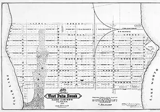 The area that was to become West Palm Beach was settled in the late 1870s and 1880s by a few hundred settlers who called the vicinity "Lake Worth Country".[5] These settlers were a diverse community from different parts of the United States and the world.[5] They included founding families such as the Potters and the Lainharts, who would go on to become leading members of the business community in the fledgling city.[6] Irving R. Henry filed the first homestead claim in 1880, claiming 131 acres (53 ha). Henry would later sell the land to Captain O. S. Porter.[7] The first non-Native American settlers in Palm Beach County resided around Lake Worth, – an enclosed freshwater lake at the time – named after Colonel William Jenkins Worth, who served in the Second Seminole War in 1842.[8] Reverend Elbridge Gale and his son are believed to have constructed the first log cabin on the western shore of Lake Worth, located near where the intersection of 29th Street and Poinsettia Avenue stands today.[9] Most settlers engaged in the growing of tropical fruits and vegetables for shipment to the north via Lake Worth and the Indian River.[10]