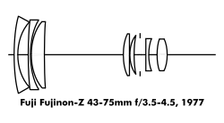 In 1977, zoom lenses had advanced far enough that the Fuji Fujinon-Z 43-75mm f/3.5-4.5 (Japan) became the first zoom lens to be sold as the primary lens for an interchangeable lens camera, the Fujica AZ-1 (1977, Japan) 35mm SLR, instead of a prime.[110]