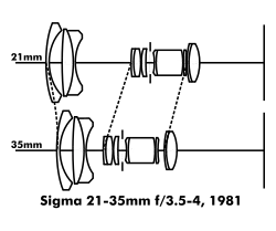 The next landmark zoom was the Sigma 21-35mm f/3.5-4 (Japan) of 1981. It was the first super-wide angle zoom lens for still cameras (most 35mm SLRs). Previously, combining the complexities of rectilinear super-wide angle lenses, retrofocus lenses and zoom lenses seemed impossible. The Sigma's all-moving eleven element/seven group/three cell formula was a triumph of computer-aided design and multicoating.[114]