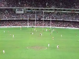 The Victorian Football League was established in 1896 when six of the strongest clubs in Victoria—Collingwood, Essendon, Fitzroy, Geelong, Melbourne, and South Melbourne—broke away from the established Victorian Football Association to establish the new league.[1] The six clubs invited two more VFA clubs—Carlton and St Kilda—to join the league for its inaugural season in 1897. Among the notable initiatives established in the new league was an annual finals tournament rather than awarding the premiership directly to the team with the best record in the season; additionally, the formal establishment of the modern scoring system was set in which six points are scored for a goal, and one point scored for a behind.