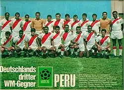 The participation of Peru in the 1970 FIFA World Cup was particularly memorable when the squad caused surprise as they advanced into the quarterfinals by defeating Bulgaria 3–2 and Morocco 3–0,[46][47][48] and despite losing 3–1 to Germany.[37][49] Although Peru lost the quarterfinal game to Brazil by 4–2,[50][51] la Blanquirroja would go on to win the Copa del Pacífico, were invited to participate in the Brazil Independence Cup, and won the Copa Mariscal Sucre.[37] Additionally, the squad won their second Copa América in 1975.[52][53][54]