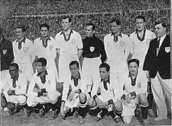In 1927, the Peru national team was officially created.[19] The team hosted the 1927 South American Championship, and Peru reached third place after losing to Uruguay by 4–0 in their debut match, defeating Bolivia 3–2, and losing to Argentina 1–5.[21] Nevertheless, due to internal corruption and the commotion surrounding the Great Depression, the team that played in the 1929 edition was selected by social favoritism rather than player skill, and lost all games.[22] A year later, la Blanquirroja was invited to participate in a new intercontinental competition, to be held in Uruguay: the first World Cup.[23]