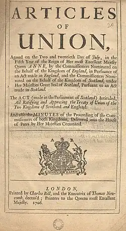The history of the United Kingdom begins in 1707 with the Treaty of Union and Acts of Union. The core of the United Kingdom as a unified state came into being with the political union of the kingdoms of England and Scotland,[1] into a new unitary state called Great Britain.[a] Of this new state, the historian Simon Schama said: